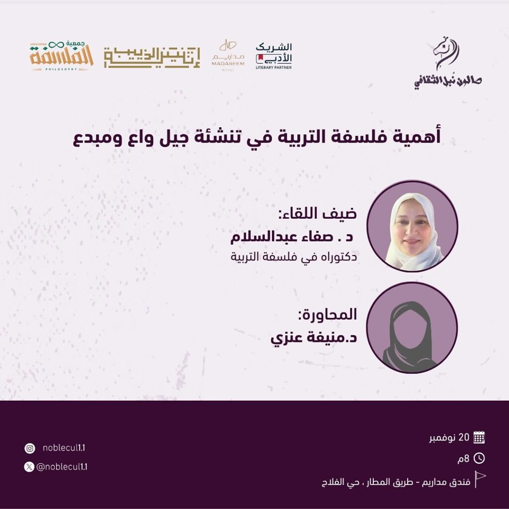 من احتفالية اليوم العالمي للفلسفة ٢٠٢٥ قدمت جمعية الفلسفة جلسة حوارية بعنوان: ” دور فلسفة التربية في تنشئة جيل واع ومبدع ” والتي قدمتها عضوة الجمعية د.صفاء عبدالسلام ، وأدار الجلسة عضوة الجمعية أ.منيفة عنزي في الرياض بالتعاون مع noblecul1.1 و الشريك الأدبي