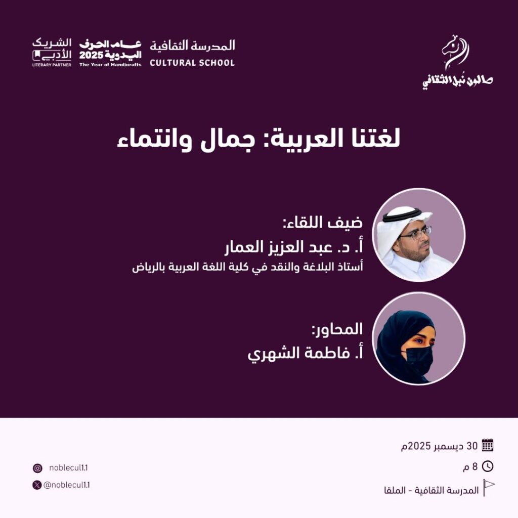 حياكم الله أصدقاء #صالون_نُبل_الثقافي ضمن مبادرات #الشريك_الأدبي بالتعاون مع المدرسة الثقافية في لقاء:لغتنا العربية: جمال وانتماء