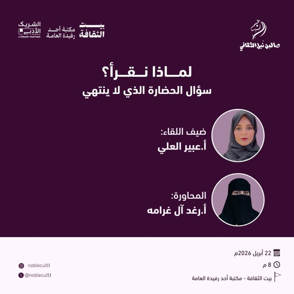 في #أحد_رفيدةحياكم الله أصدقاء #صالون_نُبل_الثقافي ضمنمبادرة #الشريك_الأدبي في بيت الثقافة #أحد_رفيدة، بمناسبة #اليوم_العالمي_للكتاب في لقاء: لماذا نقرأ ؟ سؤال الحضارة الذي لا ينتهيضيف اللقاء:أ. عبير العلي
