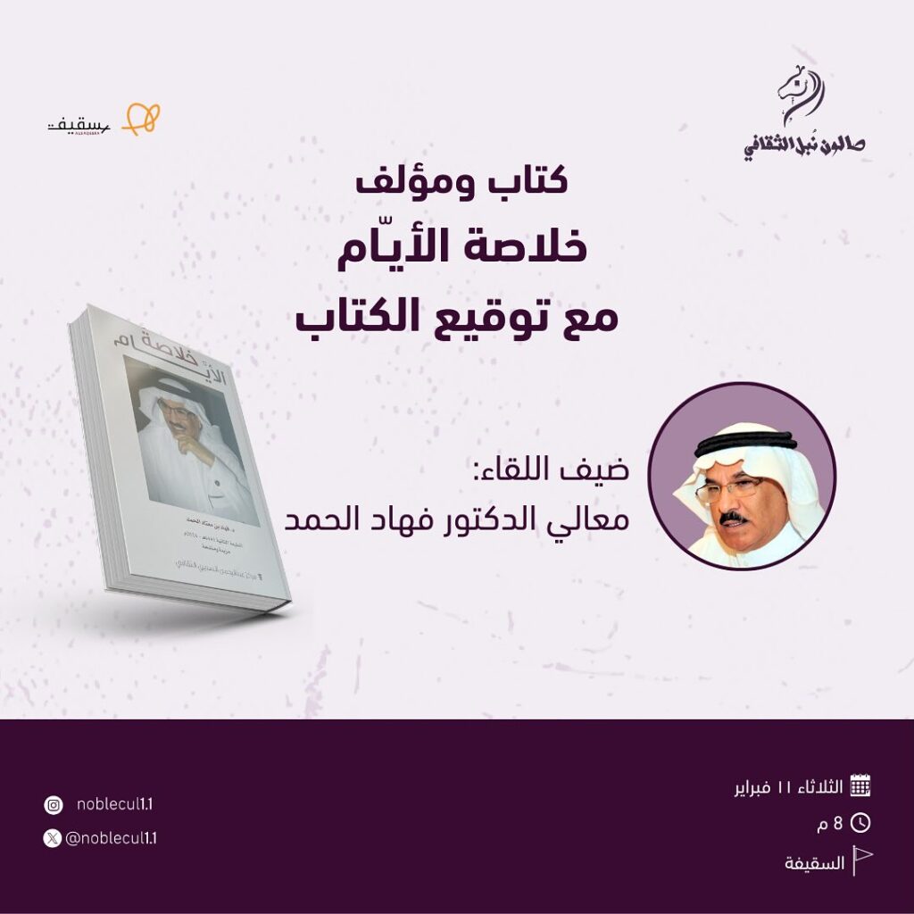 كتاب ومؤلف خلاصة الأيام مع توقيع الكتاب فبراير 11, 2025 يقول معالي د. فهاد الحمد مؤلف كتاب : ” خلاصة الأيام “عن سيرته الاستثنائية :ولم يطرأ على بالي يوما أن الطريق الذي سلكته بمحطاته وتحويلاته وبما فيه من نجاحات وعثرات سيكون موضوعا لكتاب يُنشر على الملأ وسيرة ذاتية”. ومعالي الدكتور فهاد الحمد يقول في لقاء البارحة الاستثنائي : ( خلاصة الأيام لم تكن حكايتي أو قصتي وحدي وإنما هي حكاية جيل وقصة وطن ).* الكتاب صورة من صور الوفاء لزوجته، يقول: ( فمن قاسمني الأيام حري أن يكون في خلاصتها ). وذكر البرفسور عبدالعزيز العمار في اللقاء عن كتاب ( خلاصة الأيام ) أنها سيرة ذاتية وكتاب تربوي. ومقطوعة أدبية وتطوير للذات ونموذج للشغف والهمة العالية وقصة وفاء وعرفان.